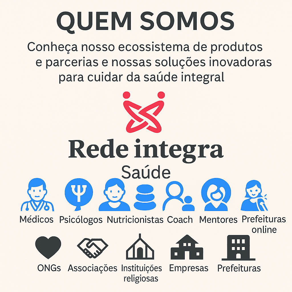A Rede Integra Saúde é uma plataforma digital de saúde que conecta pacientes, profissionais e instituições por meio de soluções inovadoras e acessíveis de cuidado integral. Aqui você conhece todos os produtos e parcerias que oferecemos para empresas, ONGs, igrejas, escolas, universidades, prefeituras e laboratórios. Descubra como ampliar o acesso à saúde, promover bem-estar e transformar realidades com a força da tecnologia e da humanização.